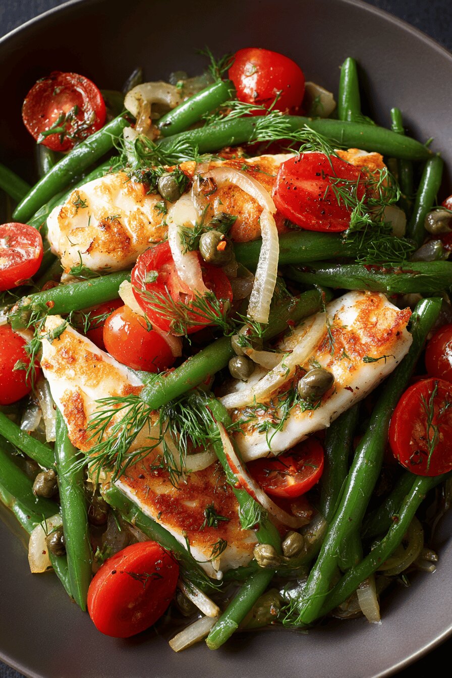 - Serve warm, not hot, on plates or shallow bowls. Beans still hold snap, fish flakes intact, tomatoes juicy but not losing form. Dill and lemon keep brightness alive.