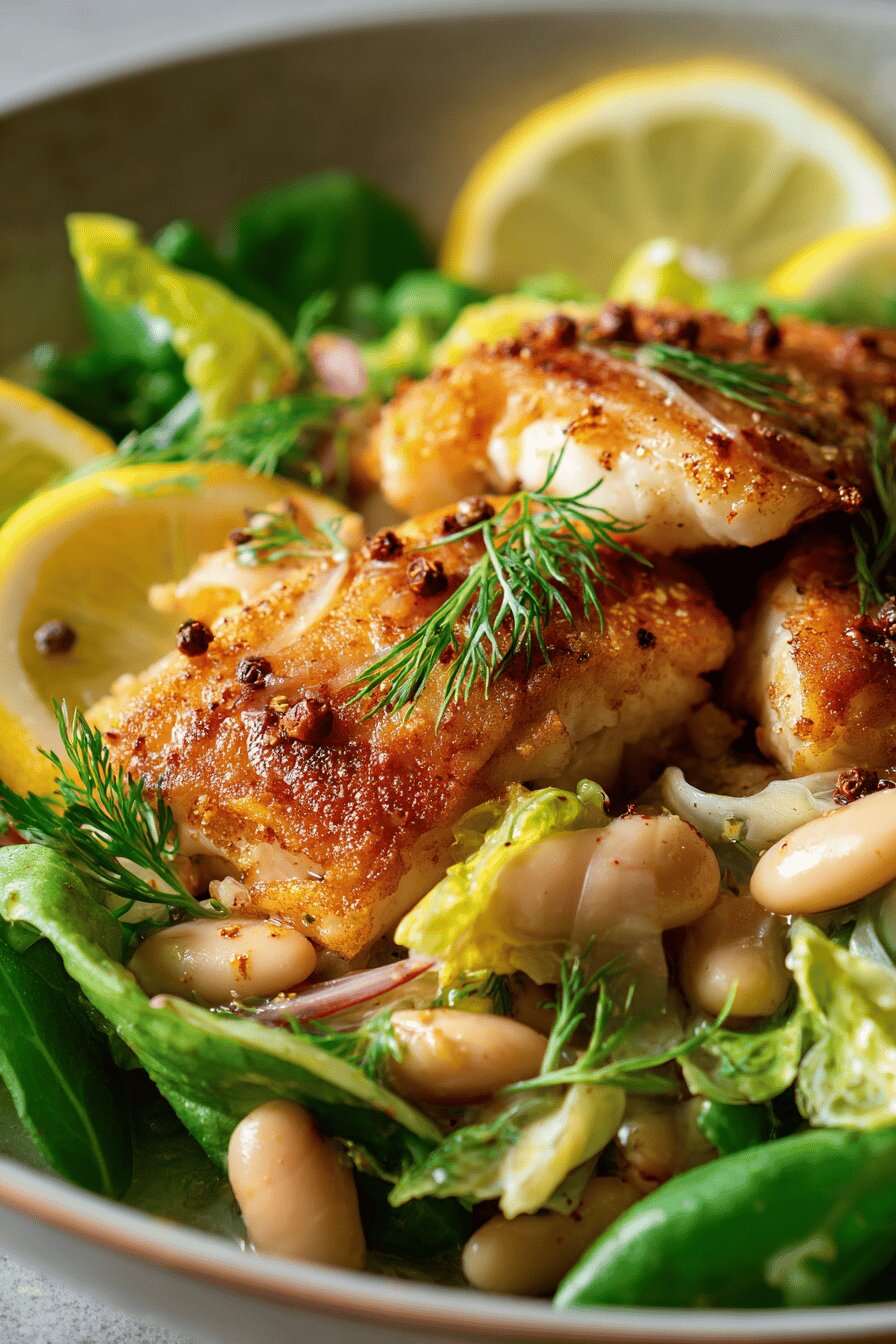 Cold beans meets warm fish, no fuss. Haddock — flaky, mild — air fried. Brushed with lime oil, light, bright. Anchovies ground down, sharpness hidden in smooth beans. Shallots give a bit of crunch, garlic punches through. Smoked paprika twists smoky into the mix, sweet yet deep. Boston lettuce torn, crisp and fresh. Herbs chopped, mingling with mint replaced by tarragon — subtle anise. Citrus laces everything, lemon wedges squeezed at the table. Quick, clean, packed with protein and fibre. No gluten, lactose, eggs, nuts. Just air fryer and a bowl. Simple layers, textural pockets. Fork in. Fish flakes, beans smooth, lettuce crisp. Each bite different. Warm-white beans, zingy oil, herbal freshness. No leftovers here.