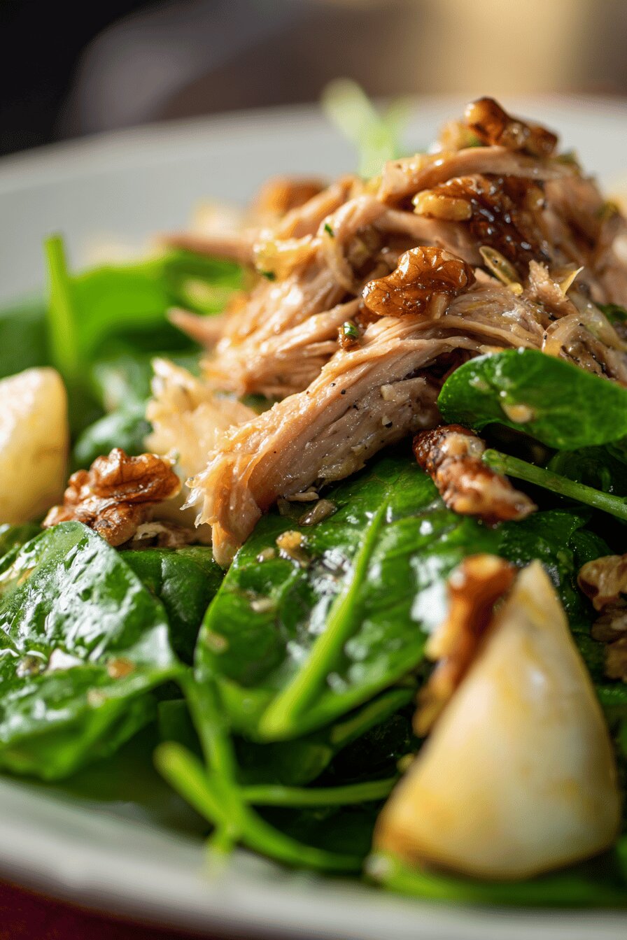 A loose salad mixing shredded warm confit partridge with fresh pears and toasted walnuts. Baby spinach swaps for mâche for a smoother base. A sharp dressing with sherry vinegar balanced by Dijon mustard and agave syrup replaces original honey and old-style mustard. Garlic hint softened with a dash of shallot. Nutty crunch, juicy sweetness, and savory meat mingle. Quick prep, slightly longer toasting nuts for depth. No dairy, eggs, gluten. Notes on variations and timing included.