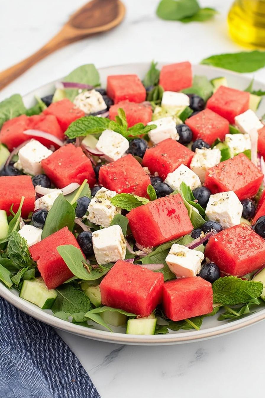 - Swapped watermelon with cantaloupe here for less watery bite and richer aroma. Blueberries stay because their slight tartness cuts through the sweet plus salinity. Feta crumbled—not cubed, so you get contrast rather than uniform cheese blocks. If cucumber is watery, scoop seeds out first to prevent salad dilution. Dressing ratio flexible—more oil for smoothness, more acid for zing. Honey optional based on how ripe and sweet fruit is. Mint elevates freshness drastically but can be left out if unavailable.