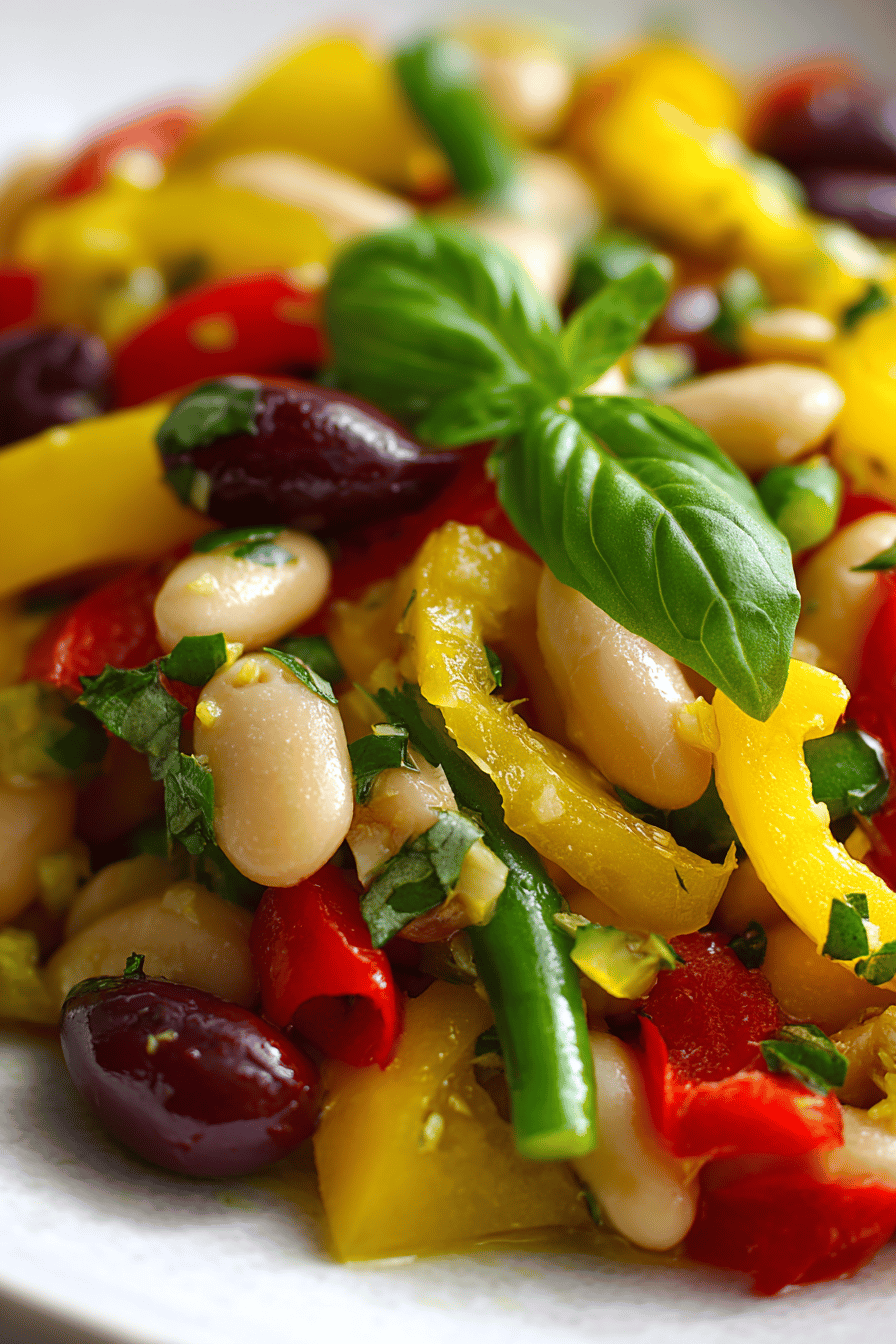 - 💡 Using yellow bell pepper instead of red gives milder sweetness. Color contrast matters here. Chopping olives smaller than usual prevents overpowering salty hits. Lime zest and juice brighten. Zest is key. Don’t skip. Not lemon but lime makes acid punch sharper, distinct. Mix all ingredients evenly but gently. Avoid smashing soft beans. Basil chopped fine but added last to avoid bruising. Olive oil drizzle blends acidity and saltiness. Salt after tasting. Olives already salty enough. Rest salad briefly. Enhances melding flavors. Serve chilled or at room temp for textural contrast.