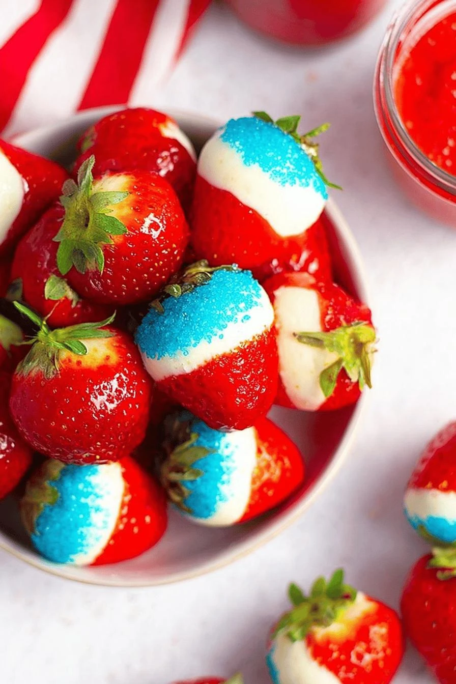 - 3 Hold strawberry by leafy top, dip fully into white chocolate. Lift with twisting motion, shake excess off—sloppy chocolate sticks unevenly. Immediately dip just pointed end into bowl of blue sprinkles or crushed freeze-dried blueberries. Sprinkles better applied fast before chocolate dulls and sets. Avoid sprinkles all over strawberry; visually confusing and melts in fridge.