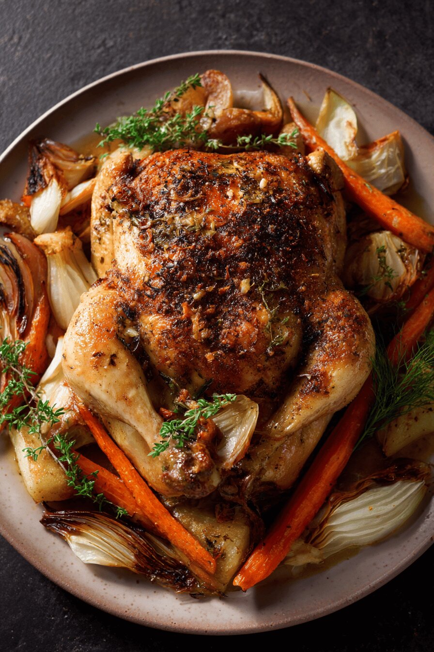 - 💡 Roast veggies cut chunky for aroma and natural sugars; don’t drown with water or veg stew. Just a thin shim of water to keep fond safe. Fond smells nutty, brown but no bitter burnt parts. Don’t stir veg or they’ll mush. Keep veggies loose under chicken, catch drips, build complexity.