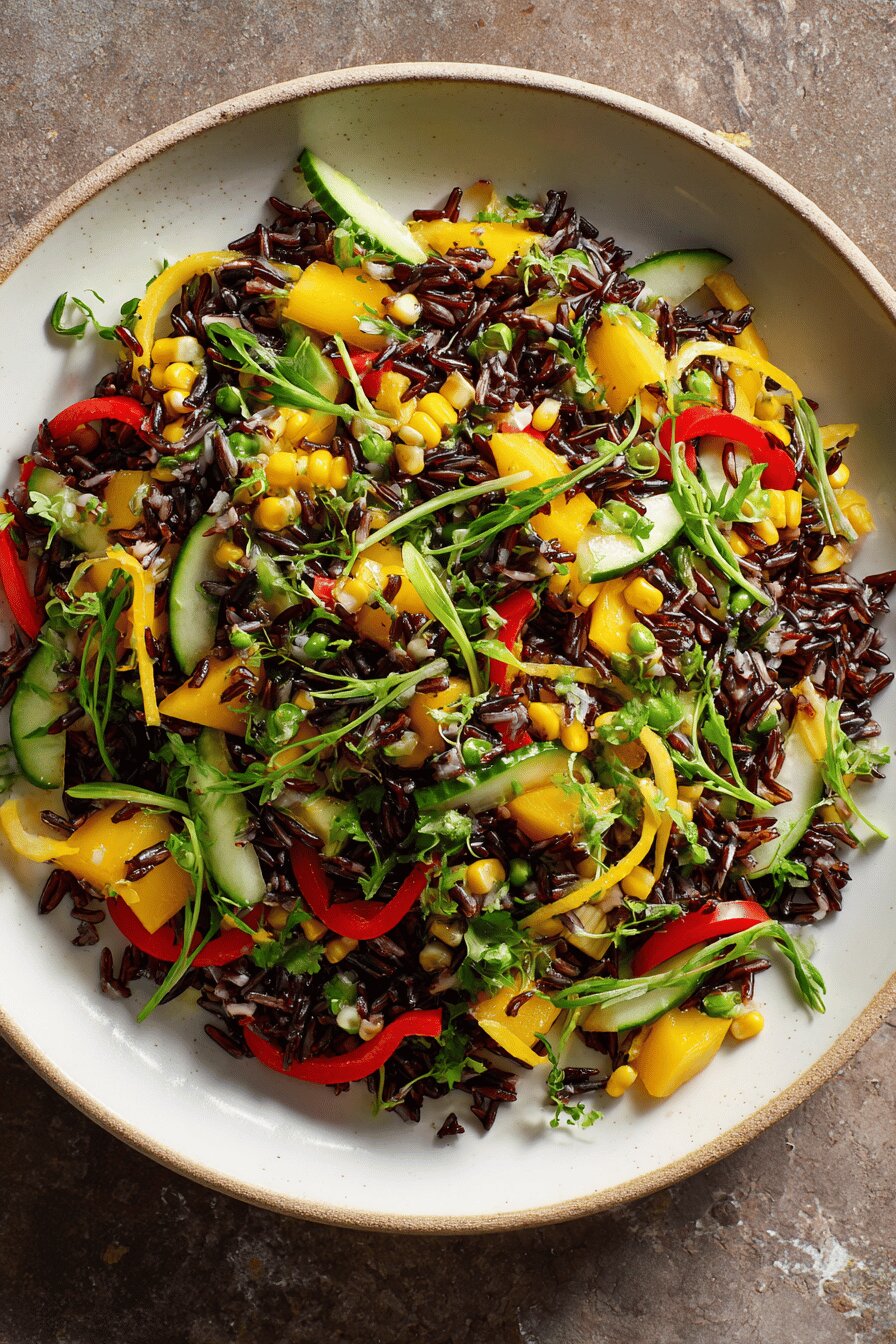 A wild rice and black bean salad packed with fresh veggies, herbs, and a touch of citrus. Wild rice simmers down to a chewy, nutty base; black beans add creaminess. Crunch from celery and pepper. Sweet apple bits mingle with juicy corn. Red onion and fresh herbs lift it all. Lime juice and olive oil bring zing and silkiness. No dairy, gluten, or nuts. Easy, colorful, bright. Great alongside grilled meats or as a standalone light meal.