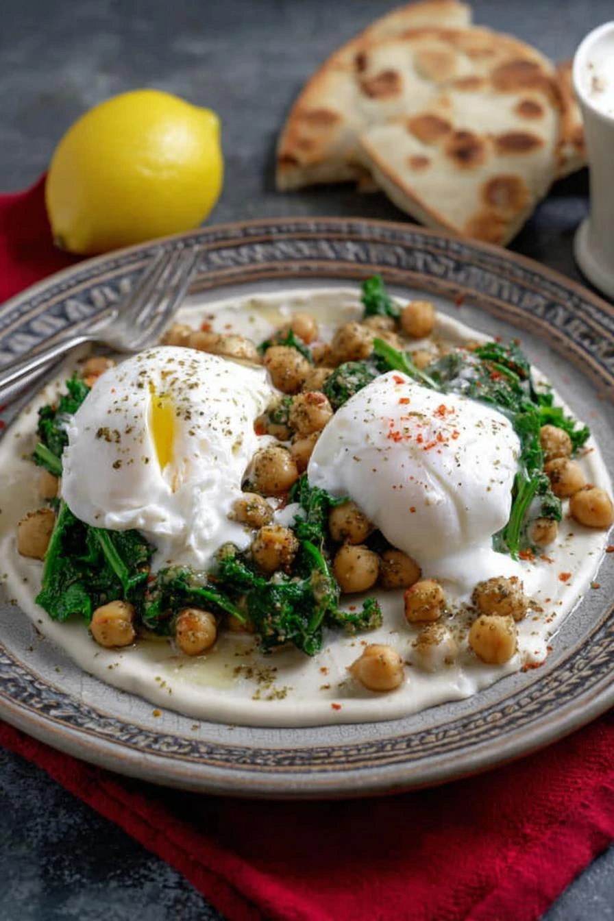 Can I do this as a turkish egg dish or shakshuka instead? Turkish egg — sure. Skip the yogurt bed, use just the chickpeas and spinach, nestle the poached eggs on top, drizzle with olive oil. Mediterranean shakshuka leans spicier and uses tomatoes. This isn’t that. Similar vibe, different thing.
