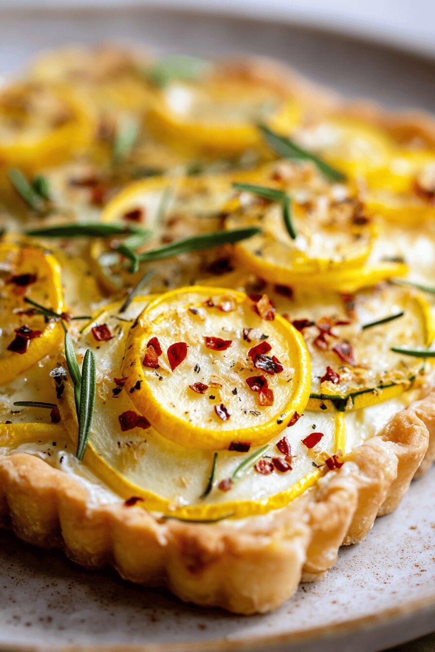 Ricotta serves as creamy base, binds flavors, holds moisture without sogginess. Orange zest offers subtle citrus aroma, less sharp than lemon but fragrant. Yellow squash replaces zucchini, softer skin, sweeter note, important to slice uniformly thin for even cooking. Fresh rosemary leaves hold strong piney notes, swapped for thyme to up herbaceous quality. Olive oil coats slices to prevent drying, distributes rosemary and chili flakes. Puff pastry sheet rolled slightly thinner than usual to compensate for moist ricotta and thin squash, ensuring crisp edges that don’t get mushy. Chili flakes optional but add dimension and contrast. Salt and pepper essential to bring out flavors from the beginning. Light dusting of flour prevents sticking during rolling.