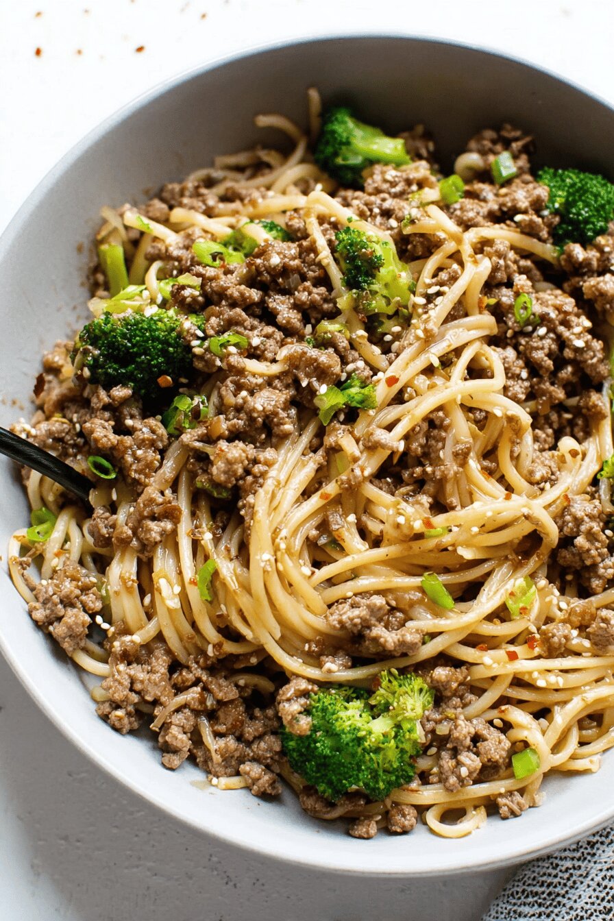 - Drain noodles right before sauce hits simmer stage; toss in skillet immediately or serve on plates and ladle beef atop. Garnish with green onions and sesame seeds for crunch contrast.