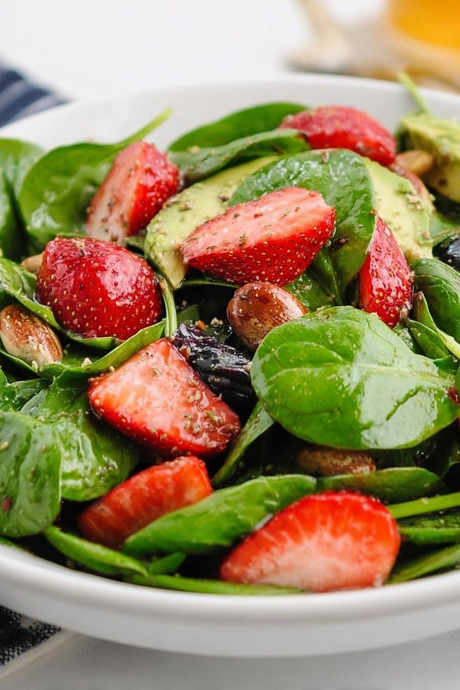 - 💡 Add strawberries and blueberries layered after spinach and nuts to avoid bruising. Cut avocado last, dice gently to keep chunks intact. Too ripe? Avocado turns mushy fast; test with gentle squeeze, firm but yields slightly. Toss salad with forks, not hands. Lift and fold motion keeps berries whole, preserves textures.