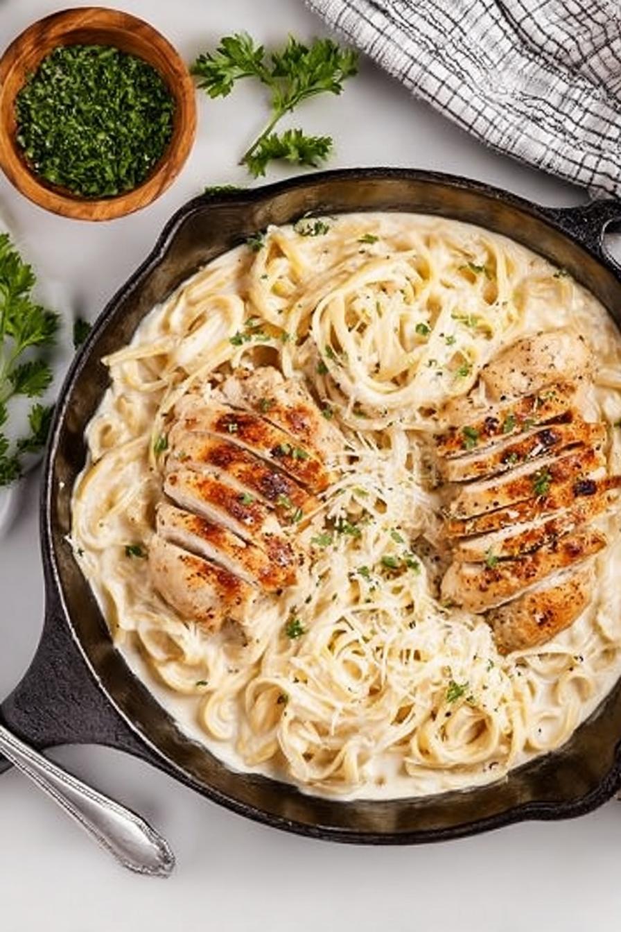 First thing: pasta al dente matters. Overcooked noodles are dead weight, ruin texture. Drain and toss with minimal olive oil immediately—that keeps strands separate before the sauce hits. Chicken seasoning mix, rub it well; if you throw it on haphazardly you get raw pockets of blandness. Medium-high heat for chicken sear; too low and it stews, too high and it burns prematurely. Rest chicken after sear—juices relax and redistribute; cutting hot meat means juices spill out, dry results. Sauce is where patience wins. Butter melts before garlic goes in to avoid burnt garlic bitterness. Flour needs to cook out that raw taste; whisk fast here or lumps wreck texture. Adding cream/milk slow, steady whisking essential to keep sauce smooth. Watch heat while it thickens; too much heat breaks emulsification. Final cheese fold in off-heat prevents clumping or stringiness. Toss pasta in sauce off-heat or minimal heat so sauce clings but doesn’t separate. Cut chicken thin like you’re carving roast beef—thin slices visually and texturally better. Parsley adds bright color to offset creamy white sauce. Serve ASAP; Alfredo thickens on standing. To reheat leftovers, do it gently in microwave with splash cream or in skillet with extra butter to bring sauce back without drying meat.