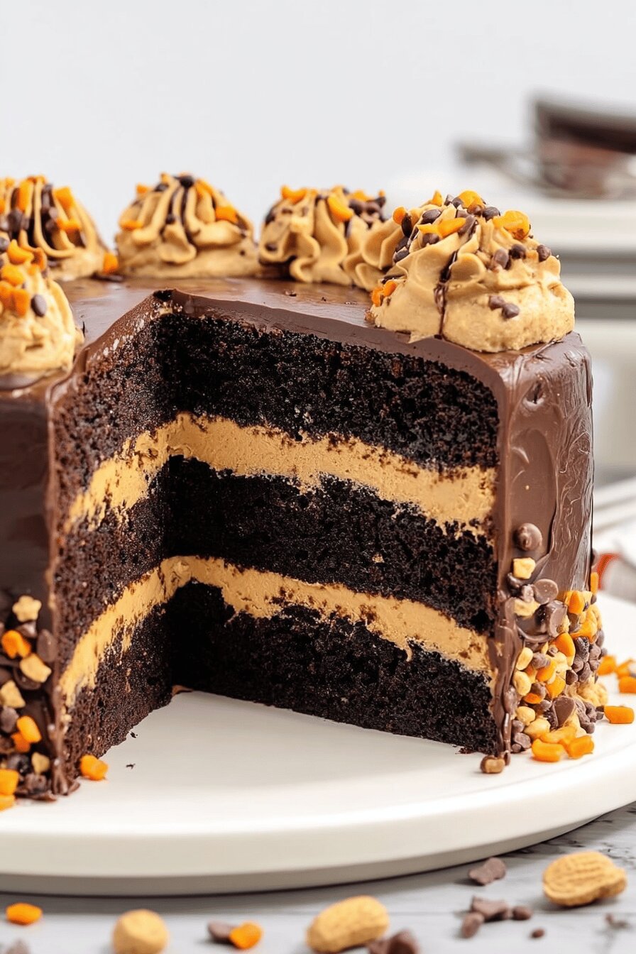 - 💡 Cake assembly sequence: trim domes first; uneven layers cause stack to waver. Reserve 1 to 1 1/2 cups frosting for crumb coat and final layer; crumb coat optional but keeps crumbs from surfacing on top. Frost each layer evenly edge to edge. Dollops piped after ganache firmed add texture contrast plus peanut butter flavor. Reese’s Pieces—optional but adds crunch, color pop, nostalgia. Store cake refrigerated especially with ganache; allow 20-minute temper before slicing for less crumb drag and better texture.