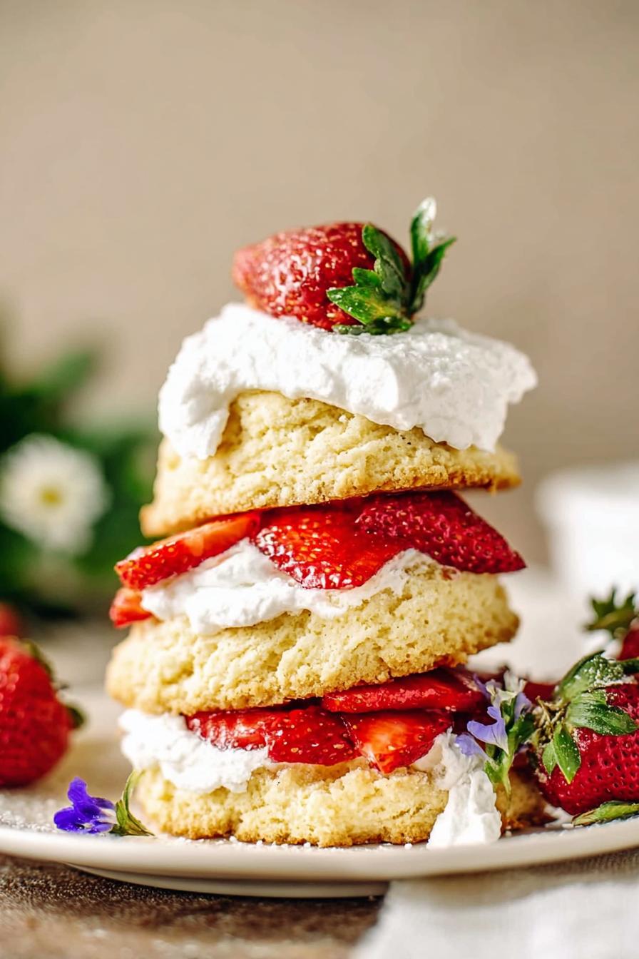 Swap buttermilk with 3/4 cup milk plus 1 tbsp lemon juice, let sit 5 minutes, for fridge-less option. Butter must be cold, cubed not melted – chunks create pockets for flakiness. If no fresh strawberries, frozen thawed work but drain excess liquid well, prevents sogginess. Lemon juice and zest brighten darken flavors in fruit and dough; skip zest and shortcakes fall flat. Sour cream in whipped cream adds a subtle tang and thickness but can be omitted for a simpler topping. Sugar level in berries can be adjusted depending on berry sweetness. Using parchment or silicone mat prevents sticking, clean edges. Heavy cream brushing seals moisture and encourages a golden finish, but can skip for rustic look.