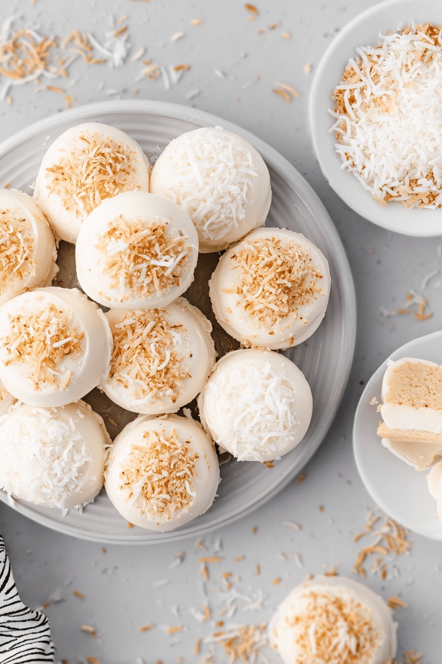 - Before coating dries (takes seconds), sprinkle reserved toasted coconut flakes over top. Timing is everything; too late and flakes won’t stick, too early and coating messes up. Repeat dipping and sprinkling for all balls.
