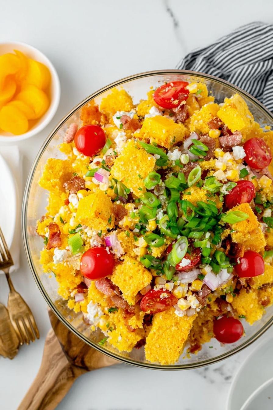 Cover tight in fridge. Can last 2-3 days. Add scallions fresh on serving day else turn limp. Dressing might separate a bit; whisk to remix. Keep cornbread slightly dry to avoid soak. Bring to temp before serving; flavors bloom cold but texture changes.