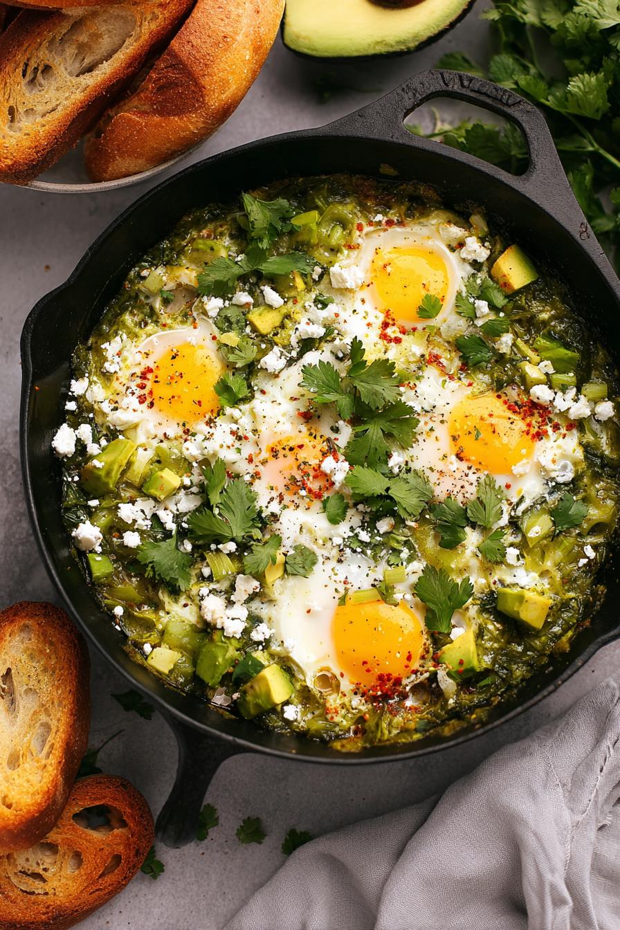 - Finish with crumbled feta, creamy avocado slices, a handful of fresh cilantro or microgreens. Sprinkle red chili flakes or hit with hot sauce for kick. Serve straight from skillet with toasted baguette, pita or rustic bread to mop flavorful juices.