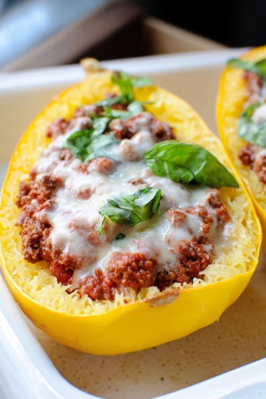 - Once squash's flesh is tender and fork-tined strands pull apart easily, remove from oven. Use a fork to fluff the inside gently, loosening strands without mashing squash walls. Spoon ricotta basil mixture generously into each half’s cavity, layer meat sauce over ricotta, and pile shredded mozzarella on top. Load it up; this is comfort food, no skimping.