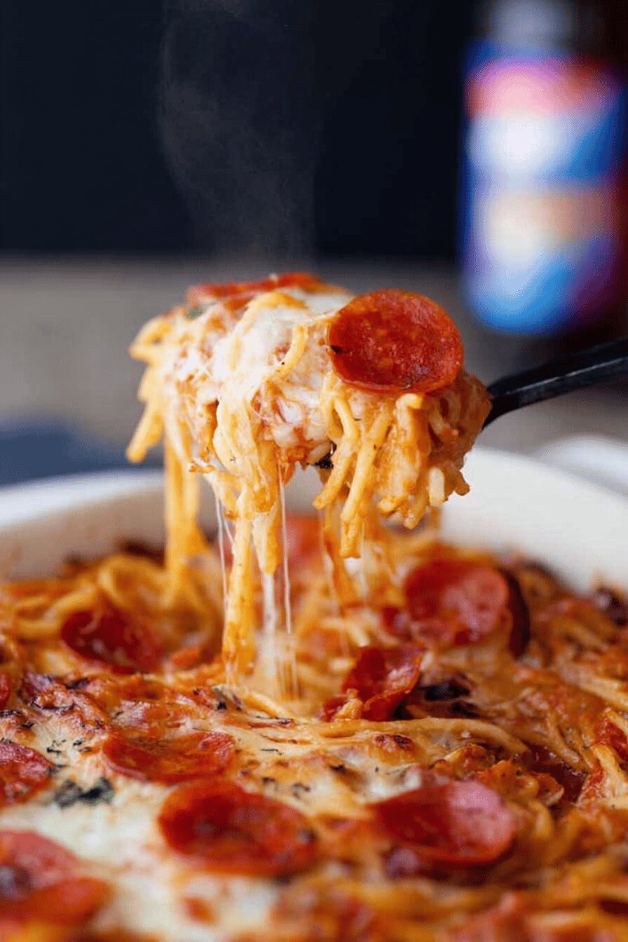 Noodles boiled just right then layered in a casserole; sauce spread thin over the bottom first. Cheese whispers between layers alongside pepperoni slices stacked generously. Baked until bubbling, the broiler hits the cheese with that golden glow — watch the pepperoni closely or it scorches fast. Blot out grease, serve hot. Familiar pizza flavors meet pasta comfort. Modest prep that yields layered, cheesy heat with crunchy pepperoni edges and saucy noodles in every forkful.
