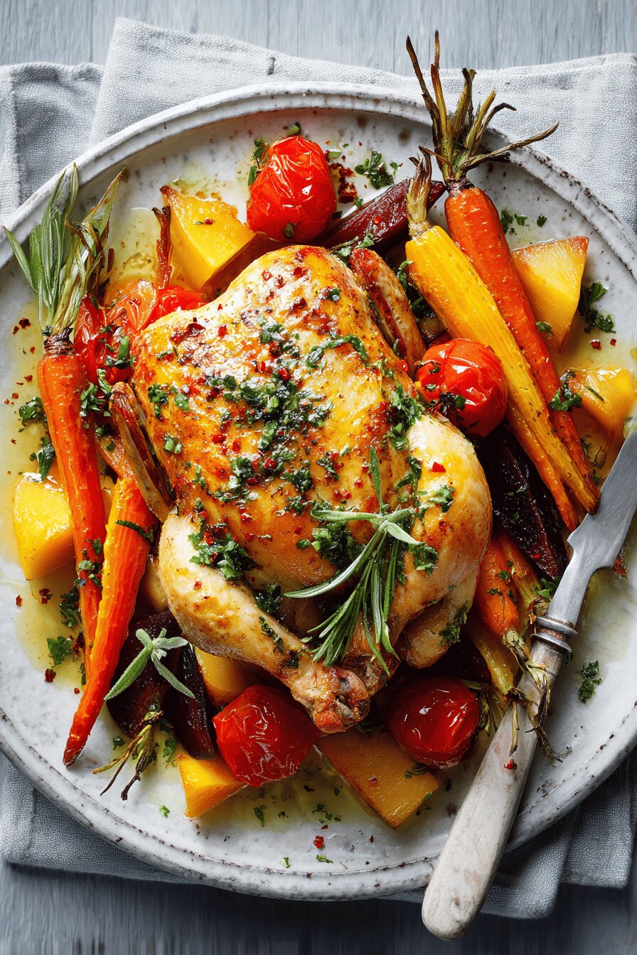 - 4. Scatter carrots, beets, tomatoes, garlic cloves, and rosemary sprigs around chicken. Salt veggies lightly, dust with chili flakes for subtle heat. Squeeze juice from remaining lemon half over vegetables, letting fresh citrus flavor brighten their sweetness during roast.