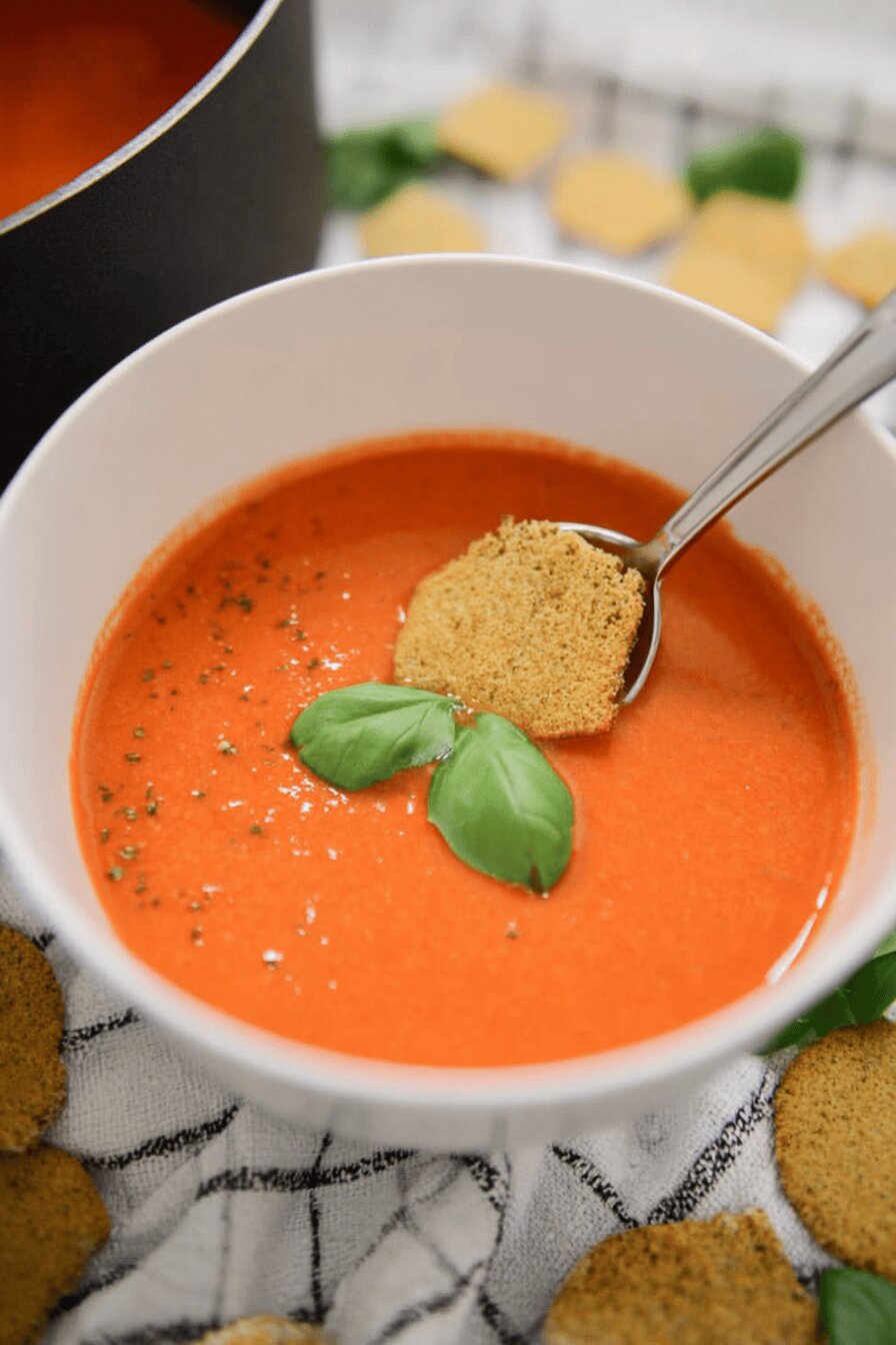 - 💡 Watch simmer carefully. Gentle bubbling with occasional small bursts, not rolling boil. Vigorous bubbles shake basil leaves apart, aroma dissipates fast. Slow simmer lets flavors deepen while keeping herb freshness alive. Leftover soup thickens in fridge. Reheat slowly, add splash broth if too stiff. Store covered fridge up to three days or freeze for longer. Reheat stirring to reincorporate any cream separation. Roast tomatoes smell distinct, a faint crackle sound happens mid-roast as sugars caramelize—listen closely. Texture after cream addition changes, richer feel coats spoon better. If soup too acidic after cream, splash more broth or pinch sugar. Test often. Final garnish fresh basil, drizzle olive oil, toasted croutons for textural contrast.