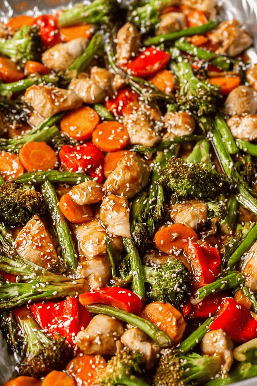 - Slide pan into oven middle rack. Start smelling nutty sesame, garlic, and gentle ginger within 10 minutes. Watch broccoli tips darken and chicken edges turn golden with slight crust forming.