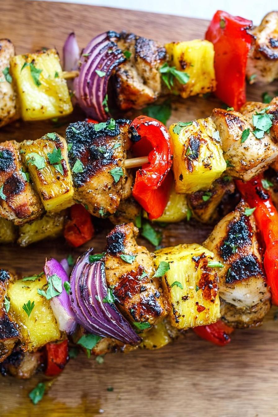 - 💡 Use sturdy metal skewers if possible. Wooden must soak long or risk burning. Alternate chicken with pineapple, bell pepper, onion. Pieces roughly same size. Pineapple sugars caramelize fast. Watch grill marks and listen for sizzle, crackle sounds. Medium-high heat only. Too hot burns outside, raw inside.