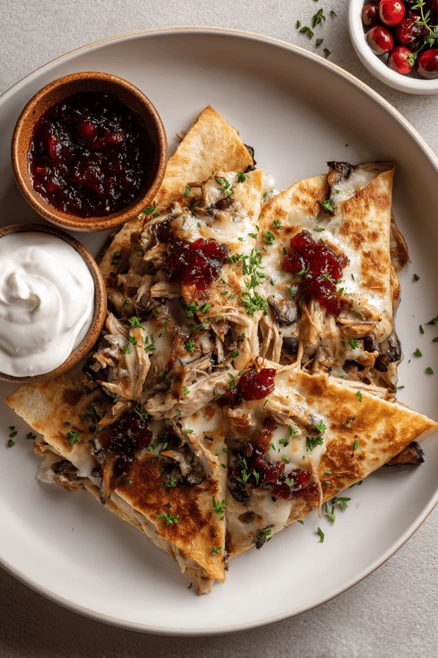 Varied mushrooms arouse extra depth but button alone works fine; just don’t overcrowd the pan or they’ll release steam, not brown. Butter essential for flavor. Olive oil swap usable but keep heat moderate. For turkey, fresh or leftover shredded meat fits the bill; moist, not dry. Cranberry jelly provides sharpness; apricot or fig jam amps sweetness if preferred. Cheese must be shredded for even melting—raclette, old cheddar, Oka even. Tortillas feel flimsy? Heat briefly before use to soften. Salt mushrooms mid-sauté to draw moisture early. Sour cream optional but adds creaminess and cooling contrast. This can feed two hungry folks or stretch for three with sides.