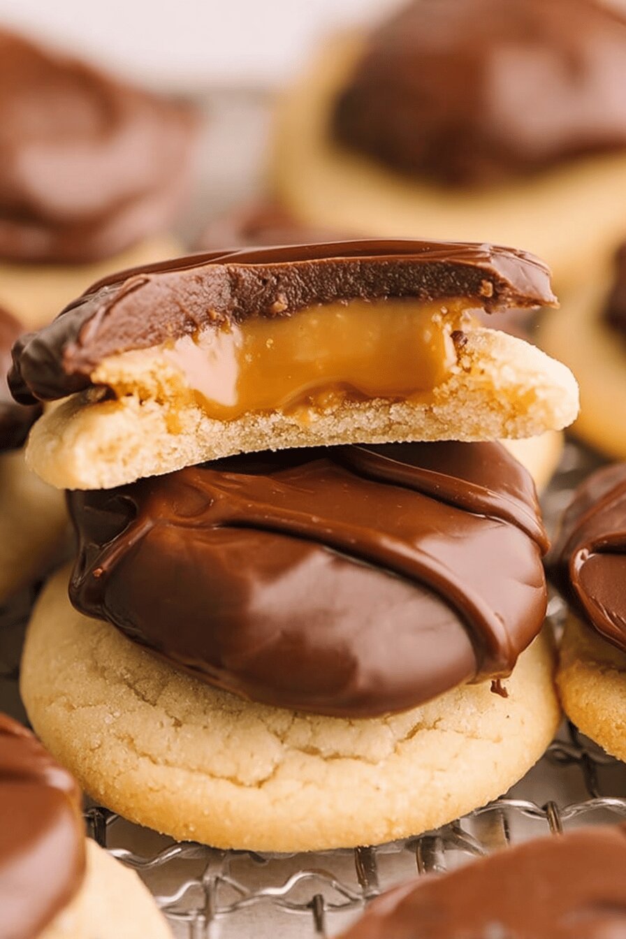 - 💡 Chill stages essential. Caramel layer must stabilize before adding ganache, else layers mix. Final fridge set firm but not frozen tight. Store cookies flat single layer; stacking leads to cracks and chocolate breaks. Bring to room temp before serving for chew texture.